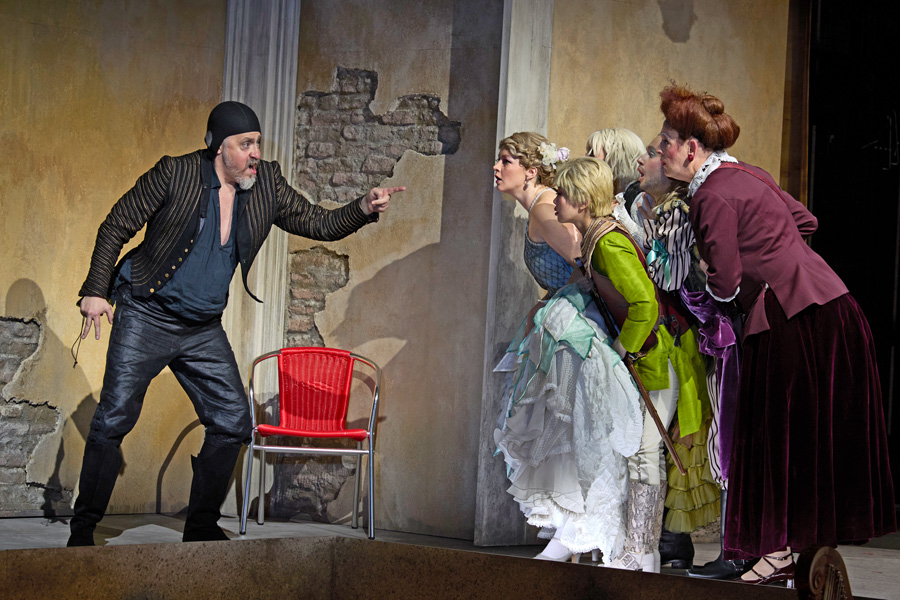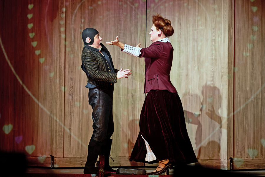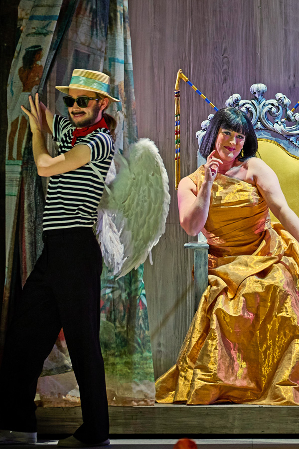 Von Venedig aus geht die Fahrt nach einem kurzen Prolog nach Ägypten. In dieser ersten Szene streiten sich die tugendvolle Philosophie und Gott Amor, wer von ihnen bei der Menschheit die größere Bedeutung habe. Als Schauplatz der Entscheidung wird der Hof von Königin Orontea, einem überzeugten Single, ausgewählt. Sie will sich nicht von der Liebe beherrschen lassen, obgleich ihr Leibphilosoph Creonte auf eine standesgemäße Eheschließung drängt. Mit der Ankunft des Malers Alidoro und dessen Mutter Aristea setzt jedoch Amors tolles Treiben ein. Mit seinen Pfeilen verwirrt er zuerst die Gefühle der Königin, um in der Folge den gesamten Hofstaat in ein veritables Liebeschaos zu stürzen. Standesdünkel haben darin ebenso ihren Platz wie Skrupel um eine alleinregierende Frau. Giacinto Andrea Cicognini hat dazu das Libretto geschrieben und nicht an Gags und heiterer Ironie gespart. Vertont wurde diese Version von Antonio Cesti, der ursprünglich Franziskaner und später über Innsbruck und Rom als Kapellmeister am Hof von Kaiser Leopold I. tätig war, bevor er dem von seinen Opern geforderten Prunk den Rücken kehrte und wieder nach Italien ging, wo er auch aus Venedig Aufträge aufnahm. Wenn Mitglieder der lautten compagney BERLIN (Leitung von Wolfgang Katschner) in die Kammeroper einmarschieren, wird das Publikum mit dem Schlag des Tamburins unvermittelt in das 17. Jahrhundert versetzt. Da stören auch die Ruderleiberln der Gondoliere nicht, denn bald darauf erscheinen auf der Bühne projizierte Palmen und in einem Fantasie-Ägypten die in Gold gewandete Hilary Cronin als Königin Orontea. Nach augenzwinkernder Beteuerung, alleine, also ohne Ehemann, regieren zu wollen, erscheint Creonte und versucht sie umzustimmen. Der selbe Darsteller wird in der Folge zum Diener, der dem Wein seine Liebe (in Deutsch) erklärt. Alexander Strömer ist Bassbariton und wird als Gelone zum derben Spaßmacher, aber letztlich zum wahren Weisen, der alle Verwicklungen zu durchschauen vermag. Vom roten Pfeil Amors wird nicht nur Orontea getroffen, als Alidoro (Countertenor Gabriel Diaz) als unbekannter Fremder auftaucht, was diese ob dieser scheinbar standeswidrigen Gefühle jedoch in ärgste Bedrängnis bringt. Das spitze Herz sticht auch die hübsche Silandra. Sopranistin Maria Ladurner führt mit dem Counter Johannes Wieners als fescher Corindo ein On-Off-Beziehung.