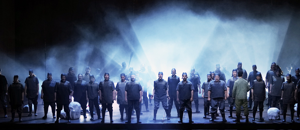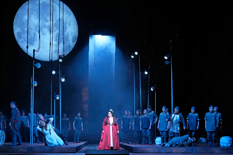 Das Thema von den geköpften Prinzen taucht schon in der orientalischen Sammlung „Tausendundein Tag“ auf. Eine Prinzessin will für den Femizid an einer ihrer Ahninnen Rache an den Männern nehmen. Wenn sich ein Königssohn um ihre Hand bewirbt, werden ihm drei Rätsel gestellt. Wenn er sie nicht lösen kann, heißt es Rübe ab! Was ist dran an dieser offenbar frigiden und blutdurstigen Frau, dass ein Bewerber nach dem anderen ihretwegen im wahrsten Sinn den Kopf verliert? Die Librettisten von Giacomo Puccini, Giuseppe Adami und Renato Simoni, waren gefordert, auf diese Frage eine Antwort zu geben. Der Komponist selbst versuchte die Seelenlandschaften der Beteiligten mit seiner Musik offen zu legen. Im letzten Akt sollte sich die Wandlung von Turandot zur liebenden Braut vollziehen. Allein, Puccini konnte die Oper nicht mehr vollenden. Er starb am 29. November 1924. Von seinen Skizzen ausgehend wurde das Werk von Franco Alfano vollendet und am 25. April 1926 in Mailand uraufgeführt, von Luciano Berio allerdings später überarbeitet. Zeit und Ort der Handlung sind das alte Kaiserreich China. Regisseurin Jasmina Hadžiahmetović dürfte aber von dessen legendärer Pracht wenig halten und hat das Geschehen in die schmucklose Zeit von Mao Zedong verlegt. Der Chor ist unisex in die schlichten grauen Anzüge gehüllt, wie sie ab 1949 in der Volksrepublik China als einheitlicher Look vorgeschrieben waren. Die Bühne wird von einem übergroßen Mond beherrscht, der über einer bedrückend mit Totenschädeln übersäten Szenerie ruht und sich erforderlichenfalls in einen überdimensionalen Gong verwandelt. Keine Spur von einem Palast oder der verbotenen Stadt. Auch von der Hektik ist nichts zu spüren, wenn dem Volk aufgetragen wird, bis Sonnenaufgang den Namen des Unbekannten zu finden. Obwohl bei Versagen die Todesstrafe angedroht ist, hängen die Untertanen recht müde herum und warten scheinbar auf eine höhere Eingebung. Grosso modo bleibt es wie bei einer konzertanten Aufführung der Fantasie des Publikums überlassen, sich den Kaiserhof im sagenhaften Reich der Mitte und das dort herrschende bunte Treiben vorzustellen.