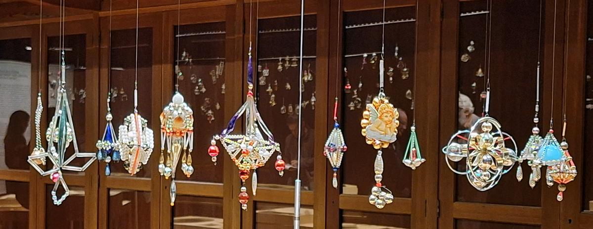 Bis Februar 2026 verwandelt sich der Kunstblättersaal des MAK zu einer Art Christkindlmarkt. Man kann zwar nichts kaufen (abgesehen vom Katalog zu dieser Ausstellung um 42 €), aber darf mit kindlich großen Augen staunen. In Vitrinen ausgebreitet und als Mobile von der Decke hängend locken den Blick mehr als 800 filigrane Kunstwerke, die eine große Aufgabe verbindet: Sie sind als festliche Dekoration für den Weihnachtsbaum gedacht. Hergestellt wurden sie aus dünnem Glas und sind damit ein sehr zerbrechliches Gut. Hohlperlen sind die Grundlage der meisten dieser glitzernden Kleinode. Sie gelten als Erfindung der Gablonzer Schmuckhersteller, die schon um 1550 erste Glashütten betrieben und 1750 mit einer wirtschaftlich äußerst erfolgreichen Produktion von Glasperlen und damit Bijouteriewaren begonnen haben. 1920 hebt in Gablonz an der Neiße, in Tschechisch Jablonec nad Nisou, eine über 60 Jahre anhaltende Blütezeit von Christbaumschmuck an, der sich bald zu einem Renner in Sammlerkreisen auswachsen sollte. Es war die Vielfalt an Themen, von der die Kundschaft fasziniert war. Es gibt nicht nur in allen Farben schimmernde Kugeln oder thematisch naheliegende Engelchen. Die Welt wurde im Miniaturformat nachgeblasen. Fahrräder, Flugzeuge, Häuser, Werkzeuge, Musikinstrumente und die Fauna in Gestalt von Spinnen, Vögeln, Schmetterlingen und Hummer finden damit bis heute neben Lametta, Schokolade in Stanniol und Kerzen Platz auf den festlich geschmückten Tannen- und Fichtenzweigen. Auch Waltraud Neuwirth, Kunsthistorikerin und ehemalige Kustodin der MAK-Sammlung Glas und Keramik, hat daran einen Narren gefressen.