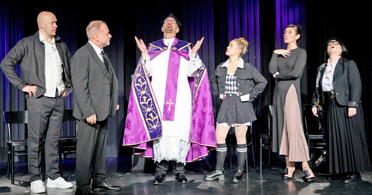 Zu einer Einsegnung braucht es einen Geistlichen, den Hubert Wolf als unglaublich geduldiger Priester an der zerstrittenen Trauergemeinde mit seiner tröstlichen „Frohbotschaft“ scheitern lässt. Am lautesten setzt sich Michelle Catherine Härle als selbstbewusste Praktikantin Emma Kernstock durch. Sie ist Studentin und Influencerin, die alles und jedes ganz genau und noch besser weiß. Ihr kann nicht einmal Alina als Head of new development das Wasser reichen. Adriana Zartl ist in dieser Rolle erst vor ein paar Tagen für Verena Scheitz eingesprungen. Mit einer Protokollmappe bewaffnet empfiehlt sie sich als heimliche Nachfolgerin des nunmehr eingeäscherten Firmenchefs – wäre da nicht ein Kevin (Alexander Hoffelner). Er ist Experte für Social Media, hängt deswegen dauernd am Handy und löst mit patscherten Postings einen veritablen Shitstorm aus.