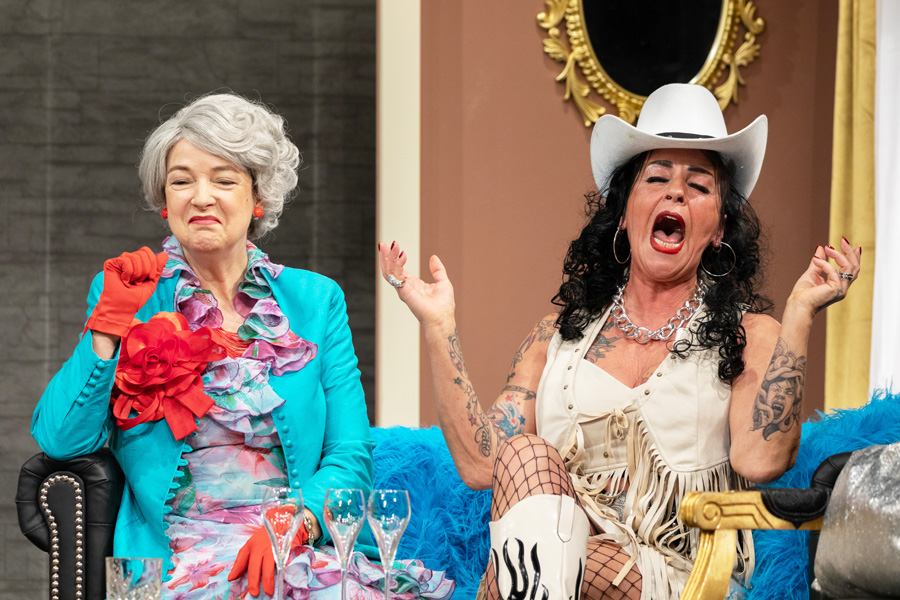 Die beiden Spezialisten für unterhaltsame Aufarbeitung jüngster gesellschaftlicher Probleme wie beispielsweise die schwindende Akzeptanz von „Extrawurst“, Dietmar Jacobs & Moritz Netenjakob, haben in der an sich wenig lustigen Trauerfeier den gewaltigen Unterhaltungswert für eine abendfüllende Farce entdeckt. Marcus Strahl, Prinzipal der Neuen Bühne Wien, hat deren „Kalter weißer Mann“ nach Wien gebracht. Unter seiner Regie wurde von einem grandiosen Ensemble in der Bar Casanova Vienna das darin enthaltene Feuerwerk an Pointen gezündet und dem Publikum ein Dauerlachen beschert. Michelle Catherine Härle, Claudia Rohnefeld © Robert Peres Zu einer Einsegnung braucht es einen Geistlichen, den Hubert Wolf als unglaublich geduldiger Priester an der zerstrittenen Trauergemeinde mit seiner tröstlichen „Frohbotschaft“ scheitern lässt. Am lautesten setzt sich Michelle Catherine Härle als selbstbewusste Praktikantin Emma Kernstock durch. Sie ist Studentin und Influencerin, die alles und jedes ganz genau und noch besser weiß. Ihr kann nicht einmal Alina als Head of new development das Wasser reichen. Adriana Zartl ist in dieser Rolle erst vor ein paar Tagen für Verena Scheitz eingesprungen. Mit einer Protokollmappe bewaffnet empfiehlt sie sich als heimliche Nachfolgerin des nunmehr eingeäscherten Firmenchefs – wäre da nicht ein Kevin (Alexander Hoffelner). Er ist Experte für Social Media, hängt deswegen dauernd am Handy und löst mit patscherten Postings einen veritablen Shitstorm aus.