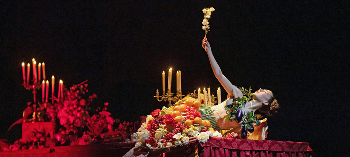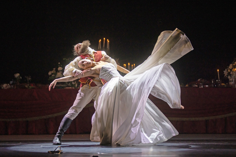 In Zeitlupe raufen Paare von Männern mit ausholenden Bewegungen miteinander. Dazu ertönt fernöstliche Musik, auf der Bühne ausgeführt von Tsubasa Hori, Shogo Yoshii und Kazutomi „Tsuki“ Kozuki. Die geheimnisvollen Kämpfer sind Mitglieder des Ballet du Grand Théâtre de Genève, das eine neue Sicht auf die Musik von Johann Strauss eröffnen soll. Der belgische Choreograf Sidi Larbi Cherkaoui hat sich unter dem Motto „Imperial Ball“ der österreichischen Tanzmusik des 19. Jahrhunderts genähert und erstaunlich abgründige, finstere Seiten mit dem von ihm gestalteten Tanz an die Oberfläche geholt. So wird der Walzer zur kriegerischen Auseinandersetzung, die von Soldaten in Uniformen des 18. Jahrhunderts mit Säbeln ausgefochten wird, bevor sie sich mit den Damen in biedermeierlichen Kostümen zur Drehung im Dreivierteltakt oder im Hüpfen der Quadrille amüsieren. Unterbrochen wird das Geschehen von Gedankenpausen, die von Taiko Trommeln, traditionellen Saiteninstrumenten und japanischem Gesang ausgefüllt werden. Der Pentatonik, dem in Japan und China seit jeher verwendeten Fünftonsystem, folgen unmittelbar wieder die voll tönenden Harmonien, wie man sie vom Donauwalzer oder von der Polka schnell „Unter Donner und Blitz“ gewohnt ist. Gemeint ist mit dieser Begegnung eine Erinnerung an die Öffnung Nippons in etwa zu dieser Zeit, als Johann Strauss von Wien aus die Welt mit seinen Melodien eroberte. Für Cherkaoui ist der mondäne Ball zum Zeichen einer ganzen Epoche geworden. Er ist der Ort, an dem sich die Elite trifft, kontrolliert von einem aristokratischen Verhaltenskodex und strengen gesellschaftlichen Regeln, unter denen auch Politik gemacht wird. Ist es der dabei getanzte Walzer, der uns in seiner rauschhaften Drehung dabei nichts als Lebenslust vorspiegelt? Die Antwort darauf gibt das vom Oscar-prämierten Szenografen Tim Yip gestaltete Bühnenbild. Feudale Pracht mit festlich gedeckter Tafel und Kirchenfenstern wechselt sich mit düsteren Kriegschauplätzen und offensichtlichem Zerfall ab. Daran hat sich bis heute nichts geändert.