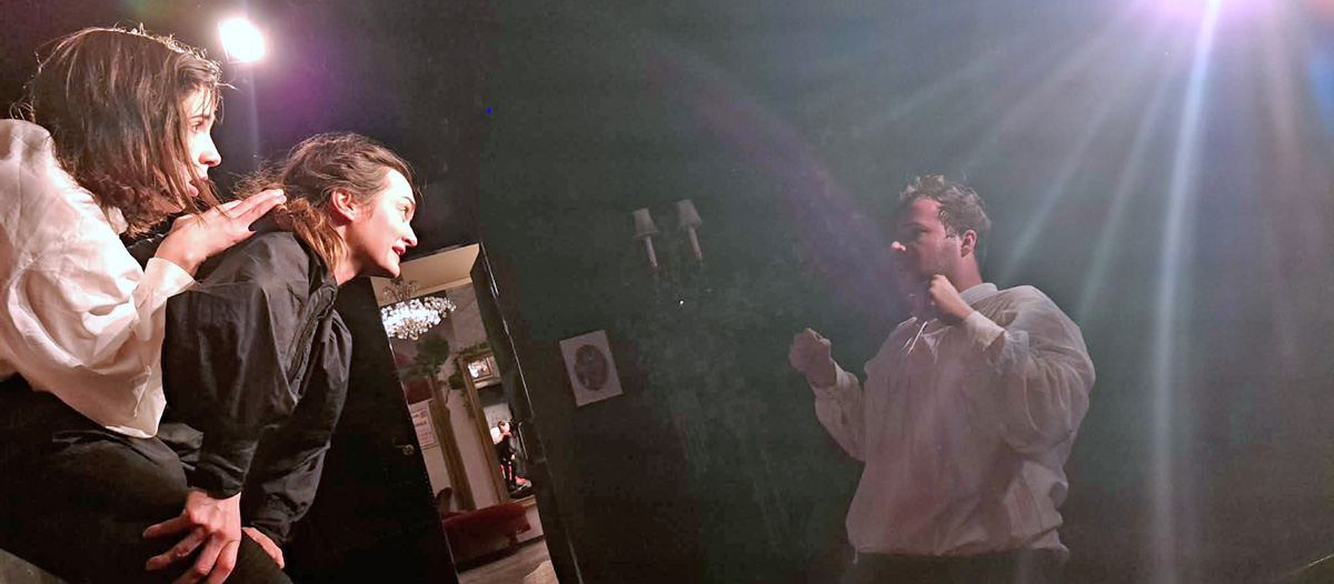 Christoph Prückner hat sich mit seiner Truppe dieser Kurzfassung für das Theater Center Forum unterzogen. Er benötigt dafür zwei Schauspielerinnen und einen „zufällig ausgewählten Gast“ aus dem Publikum. Anaïs Marie Golder, Viktoria Hillisch und David Stöckl sind die Mutigen, die, wie großspurig angekündigt wird, alle von Shakespeare vorgesehenen Rollen verwirklichen wollen. Auf den schwarzen Wänden der von Erwin Bail gestalteten Bühne sind die Titel wie auf einer Schultafel mit Kreide notiert. Nach dem launigen Prolog geht es an die berühmteste und traurigste Lovestory aller Zeiten. Anaïs ist ein zarter Romeo, David higegen Julia und nebenbei der streitlustige Tybalt.