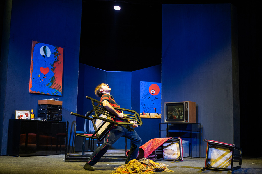 Der deutsche Regisseur Felix Metzner hat „Mein wunderbarer Waschsalon“ als unsanften Denkanstoß für das Theater zum Fürchten inszeniert. Robert Notsch hat dazu die sozial benachteiligte Wohngegend im südlichen London auf die Bühne gezaubert, mit allem Drum und dran, von der finsteren Ecke für Gewaltausbrüche über den orientalischen Plüsch einer Wohnung bis zum fahrplanmäßigen Wirbel einer über die Rampe donnernden Eisenbahn. Dazwischen dreht sich der Waschsalon. Dessen Betreiber ist der betuchte Geschäftsmann Nasser, authentisch verkörpert von Markus Tavakoli. Das herabgekommene Etablissement wird von ihm als Liebesnest mit Freundin Rachel (Sibylle Kos) genützt und scheint im Übrigen eher eine Anstalt zur Geldwäsche zu sein. Finanziert wird es unter anderem von Nassers brutalen Partner Salim (Philipp Stix), der seine Einkünfte aus dem Handel mit Rauschgift lukriert. Fleisch gewordene Aggression sind die arbeitslosen Faschisten Genghis (Stephan Bartunek) und Moose (Clemens Fröschl), für die Fremde nur „Kanaken“ sind, die regelmäßig verprügelt werden müssen.