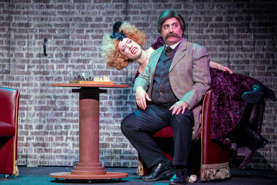 Das Theater zum Fürchten wird seinem Namen mehr als gerecht, wenn Robert Notsch Regie führt. Seine Inszenierung nimmt sich selbstverständlich aus. Man meint, sie könnte gar nicht anders sein als eine an die düstere Zelle anschließende höchst praktische Ausstattung mit Türen, Fenstern und Ahnenporträts, in der die dem Aufstieg Victors im Wege stehenden Gascoynes sauber übersichtlich nacheinander aus dem Weg und ins Jenseits befördert werden. Es ist eine wahrhaft stattliche Anzahl von potentiellen Mitbewerbern um die begehrte Stellung in der Gesellschaft mit dem Bonus einer Mitgliedschaft im House of Lords des englischen Parlaments. Dass dafür ein Schauspieler genügt, ist nicht zuletzt das Verdienst von Markus Tavakoli und unglaublich prompt arbeitender Damen in Kostüm (Sigrid Dreger) und Maske (Gerda Fischer/Pia Urbanek). Mit Szenenapplaus bedacht wird Tavakoli als Soufragette Ughtretta. Sie muss ihr dramatisches Ableben in einem unter Hochspannung gesetzten Beichtstuhl zwei Mal wiederholen, da der Henker sein Interesse an einer neuen Form der Hinrichtung bekundet. Während die rauchende und blinkende Dame erbost abgeht, kommt Calcraft zu Einsicht, dass elektrischer Strom für seine Zwecke absolut unmenschlich wäre.