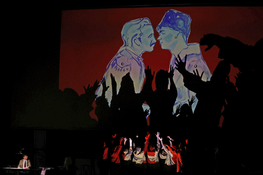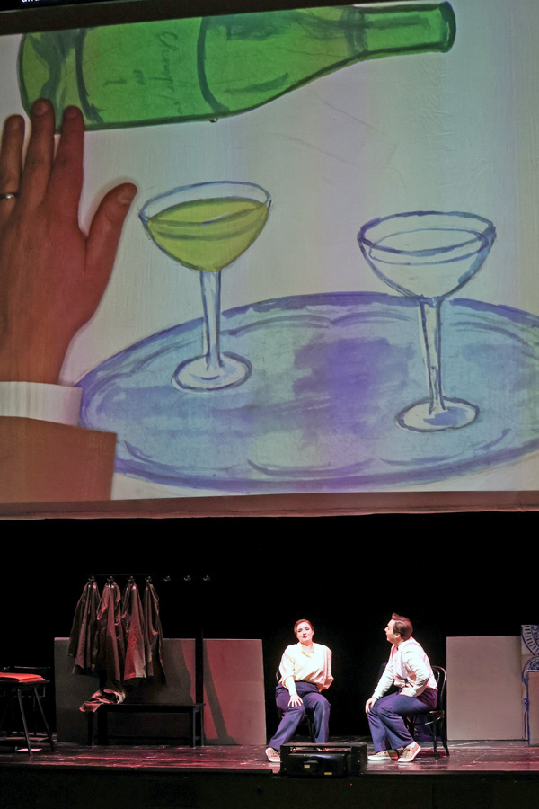 Bela Jenbach und Heinz Reichert hätten gestaunt, wie gründlich Steef de Jong ihr Libretto umgemodelt hat. An der Musik von Franz Lehár wurde im Wesentlichen nicht herumgebastelt und man freut sich auf den ersten Ton aus dem Graben, wo Meister Alfred Eschwé am Pult des Orchesters der Wiener Volksoper steht. Es dauert allerdings eine ganze Weile, bis die ersten Spaßetteln so weit erschöpft sind, dass in der Introduktion die Melodie des Wolgaliedes angespielt wird und sich Iwan und Mascha mit dem Duett „Schaukle, Liebchen, schaukle“ vorstellen dürfen. Damit keine Langeweile aufkommt, werden mit einem Projektor Aquarelle aus zügigen Pinselstrichen über den Köpfen der Agierenden auf eine raumhohe Leinwand geworfen. Bedient wird der Spieltisch vom Regisseur, der dafür Papier für spielerische Animationen zugeschnitten hat und in einer Reminiszenz an die Kindersendung „Wir blättern im Bilderbuch“ die Geschichte vom unglücklich verliebtenen Zarewitsch Aljioscha erzählt. Aus Russland wird dabei Kussland, man darf ja nicht zu direkt werden, und aus dem Palast ein Refugium in gebirgiger Waldeinsamkeit.