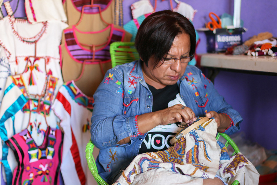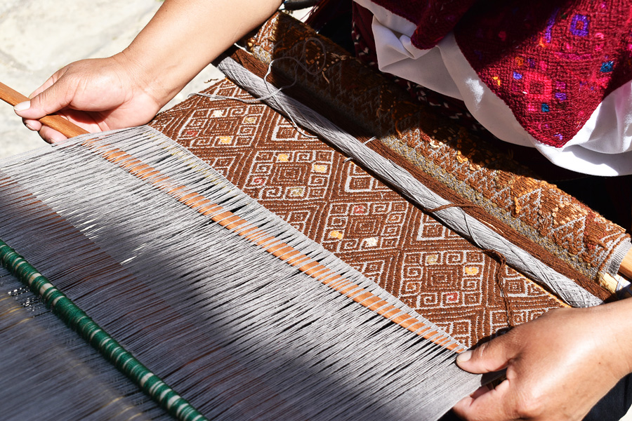 Die Frauen sitzen an einfachen Webrahmen, wie sie schon von ihren Urahninnen zur Herstellung ihrer Textilien verwendet wurden. Die Kettfäden aus Baumwolle sind zumeist hell. Die Farbe bringt der Schuss, teils hochkompliziert gefertigt, der von Hand eingeführt wird. Das Endprodukt ist eine Textilie, deren Muster über die äußerliche Ästhetik hinaus immer wieder mythologische Geschichten ihres Volkes, der Mayas, erzählen. Von Generation zu Generation wurde dieses Wissen, vereint mit der Technik weitergegeben. Dazu zählt auch die Herstellung der Farben. Sie finden sich in der Natur Mexikos und werden aus Eichenblättern, dem Brasilholz, der Studentenblume oder sogar aus dem schwarzen Schlamm gewonnen. So entstandenen Werke und deren Schöpferinnen sind nun bis 6. April 2026 im Weltmuseum Wien unter dem Titel „Die Farben der Erde. Moderne Textilkunst in Meiko“ zu bewundern.